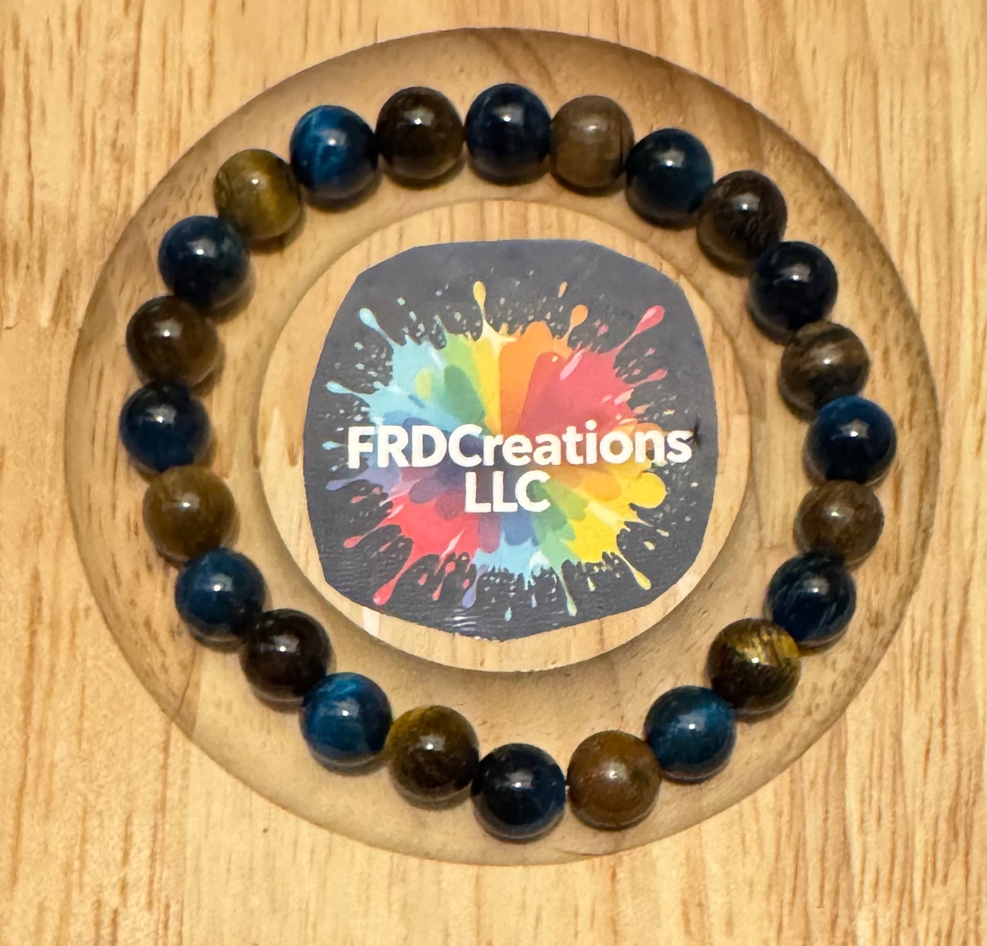 Blue and Yellow Tiger's Eye Beads on elastic. Fits up to size 7 wrist.